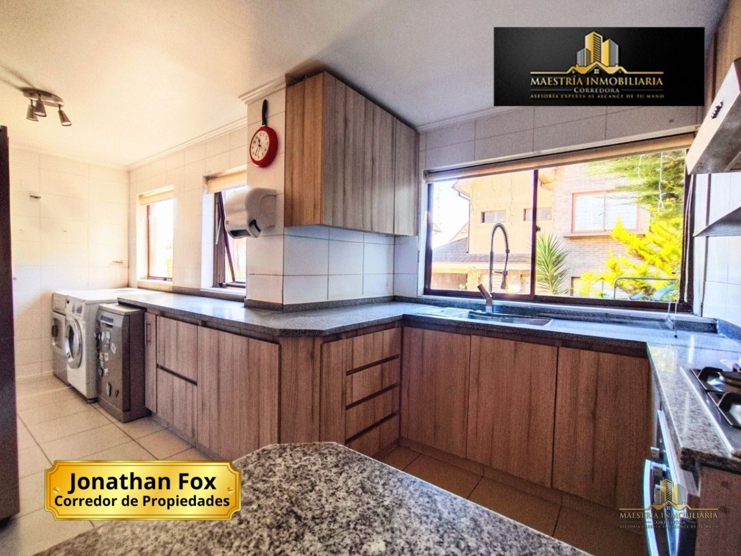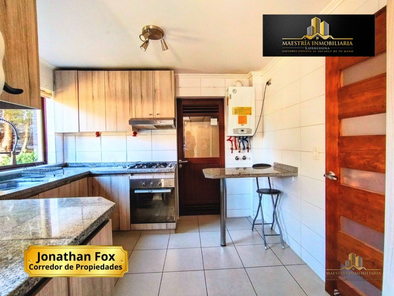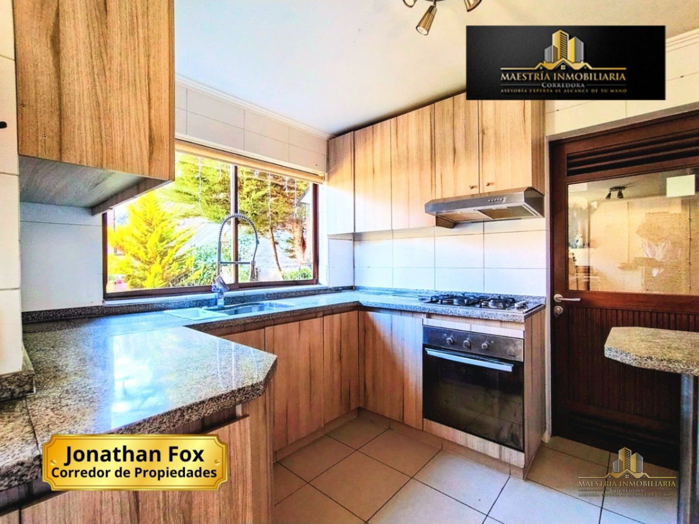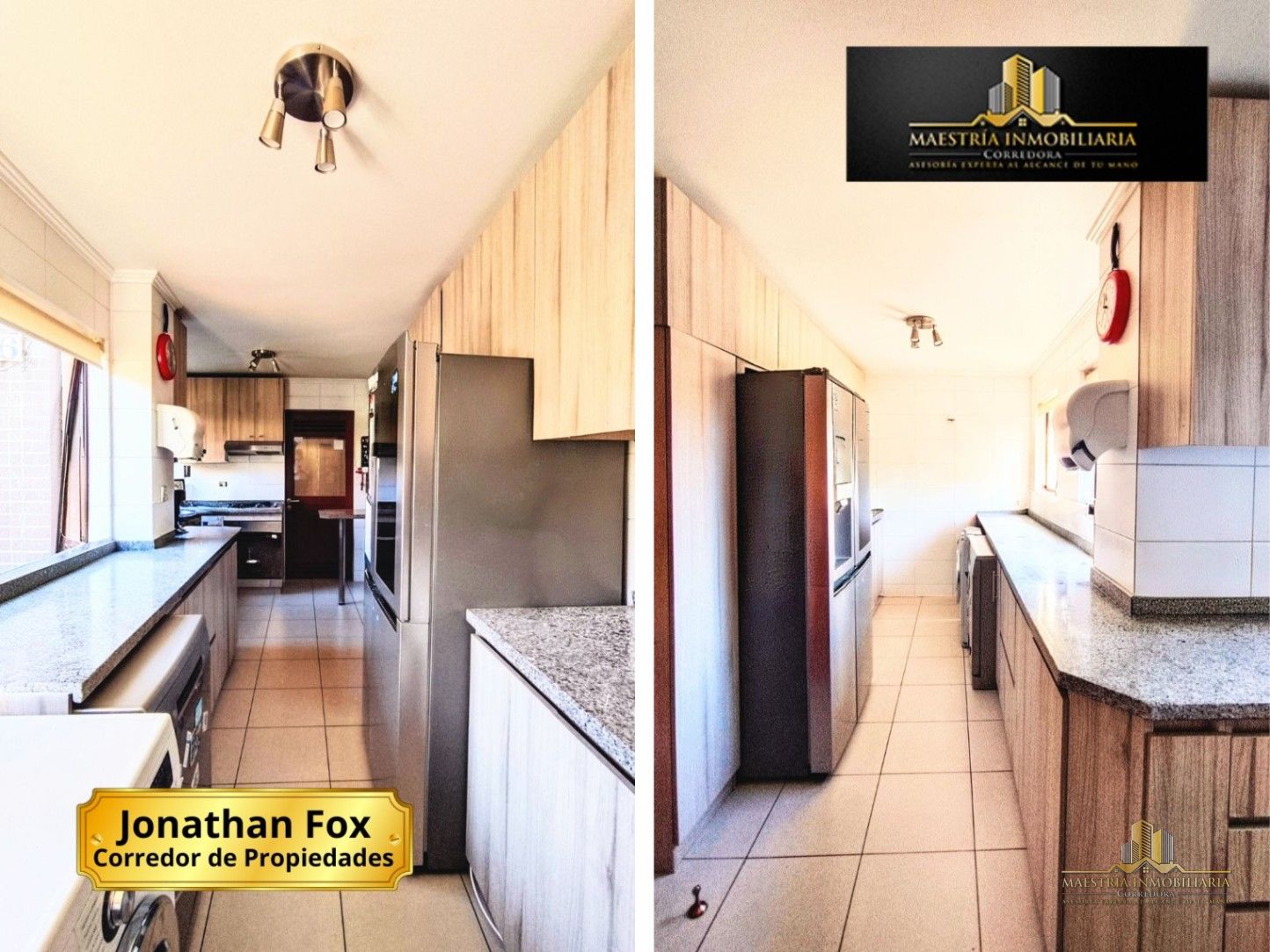Cocina independiente de estilo funcional y luminosa, con una distribución tipo galería o pasillo, que optimiza el espacio y permite una circulación cómoda. Cuenta con encimeras de granito gris, muebles en tono madera clara que aportan calidez y múltiples armarios superiores e inferiores para almacenamiento. Además, dispone de piso en porcelanato, que aporta mayor durabilidad, fácil mantenimiento y una estética moderna al ambiente.