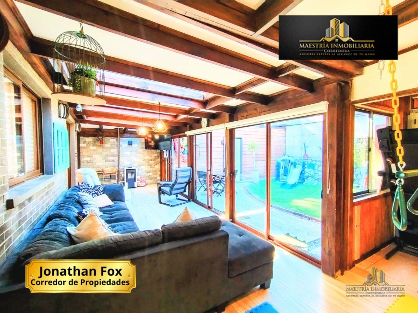 Amplia y acogedora sala de Estar (No regularizada), ideal para disfrutar durante todo el año. Este espacio cuenta con una sólida estructura de madera a la vista y techo traslúcido que permite la entrada de abundante luz natural.