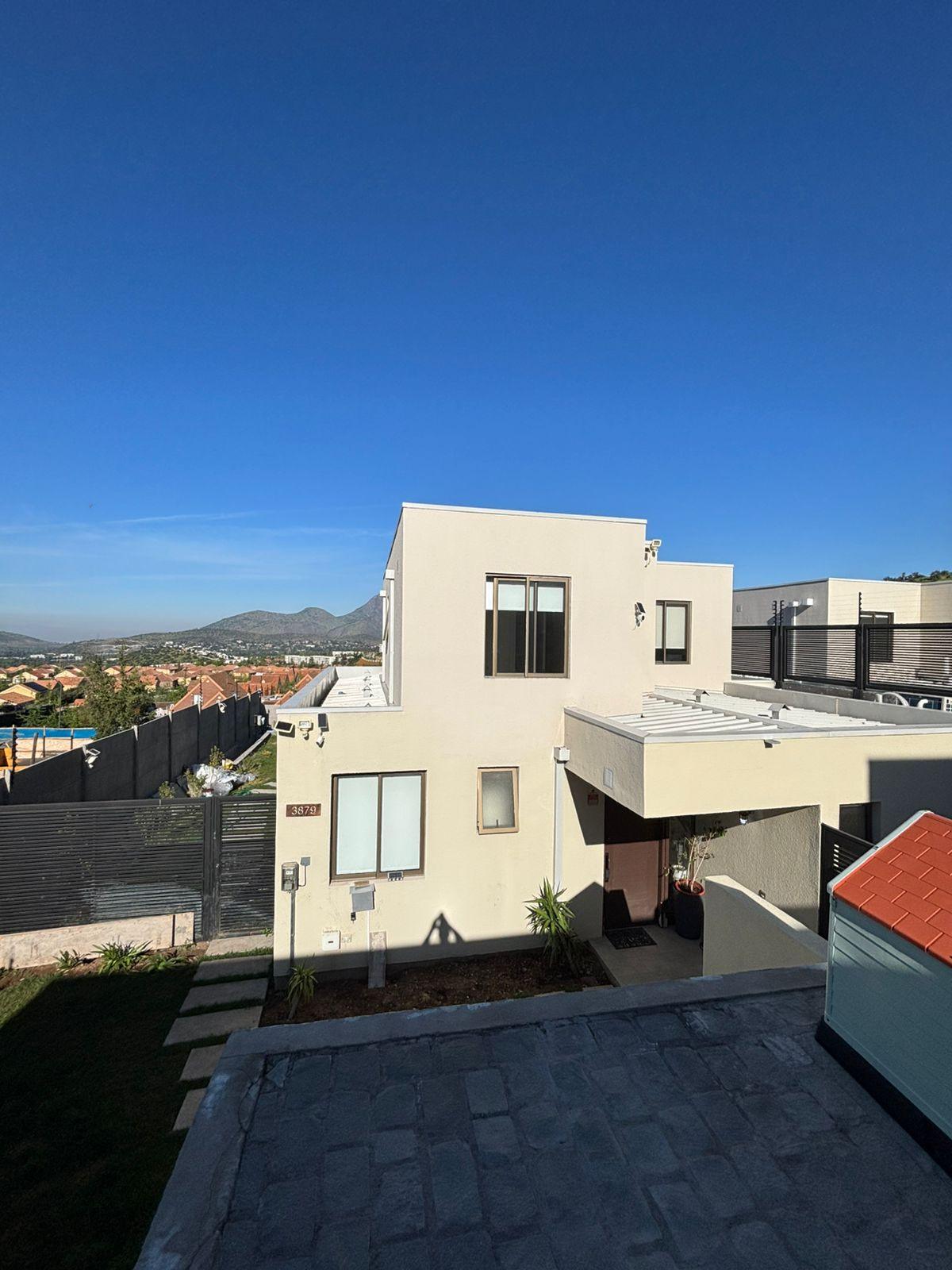 Se arrienda moderna casa estilo mediterráneo en exclusivo Barrio Alpino, La Dehesa. Con 170 m² construidos más 23 m² de terraza en un terreno de 470 m², esta propiedad destaca por su diseño funcional, finas terminaciones y una vista completamente despejada al valle.
