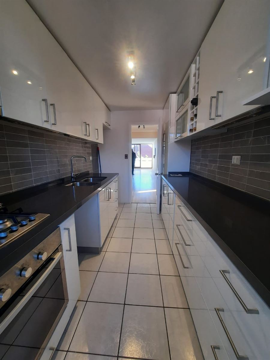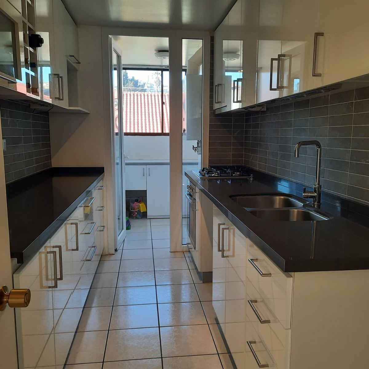 Cocina con cubiertas de cuarzo, murallas revestidas en porcelanato, gran cantidad de almacenamiento con gabinetes de cierre controlado, luce bajo muebles aéreos.