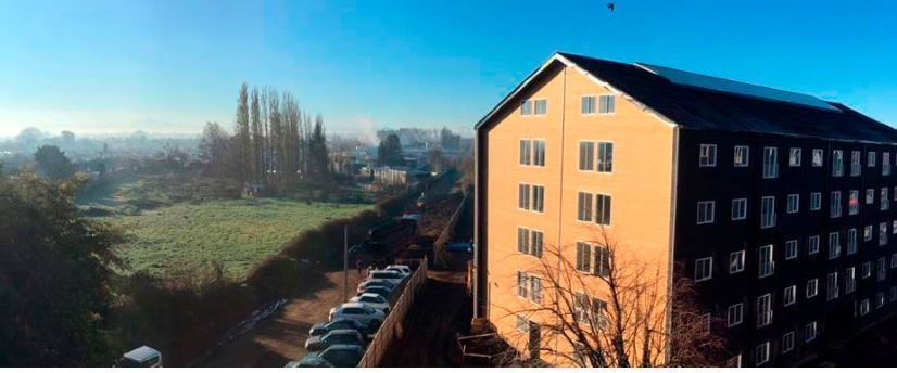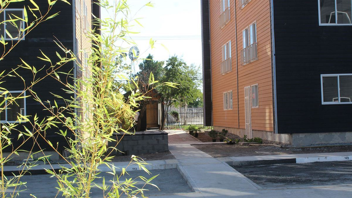 Muros divisorios departamentos: Ladrillo de Hormigón y Volcanita (24 cm de espesor)- Elemento Acústico; Envolvente exterior: Madera- Elemento Térmico Ventanas de PVC Blanco – Control de humedad;