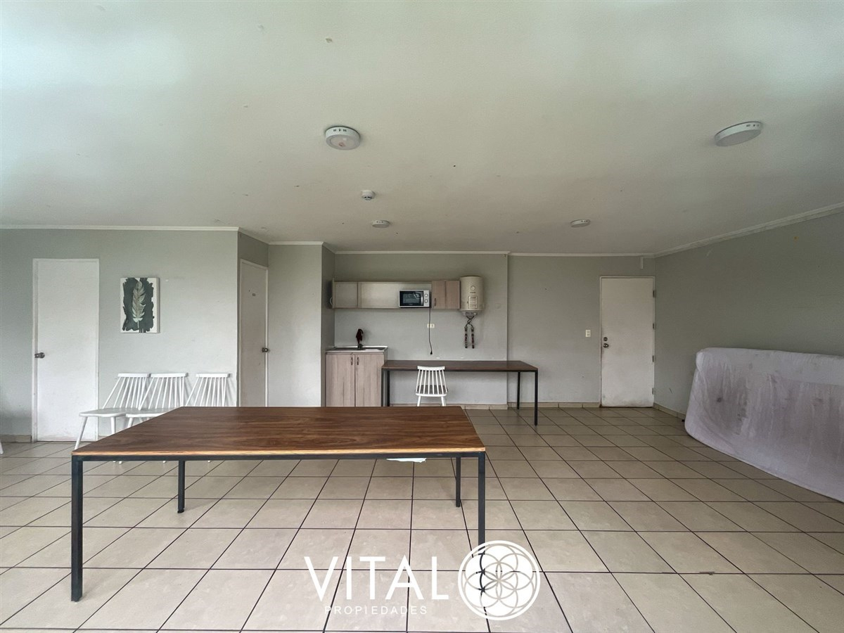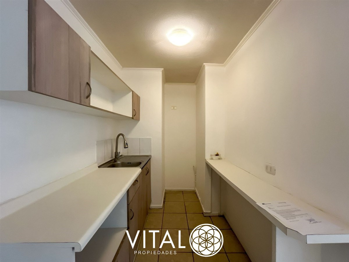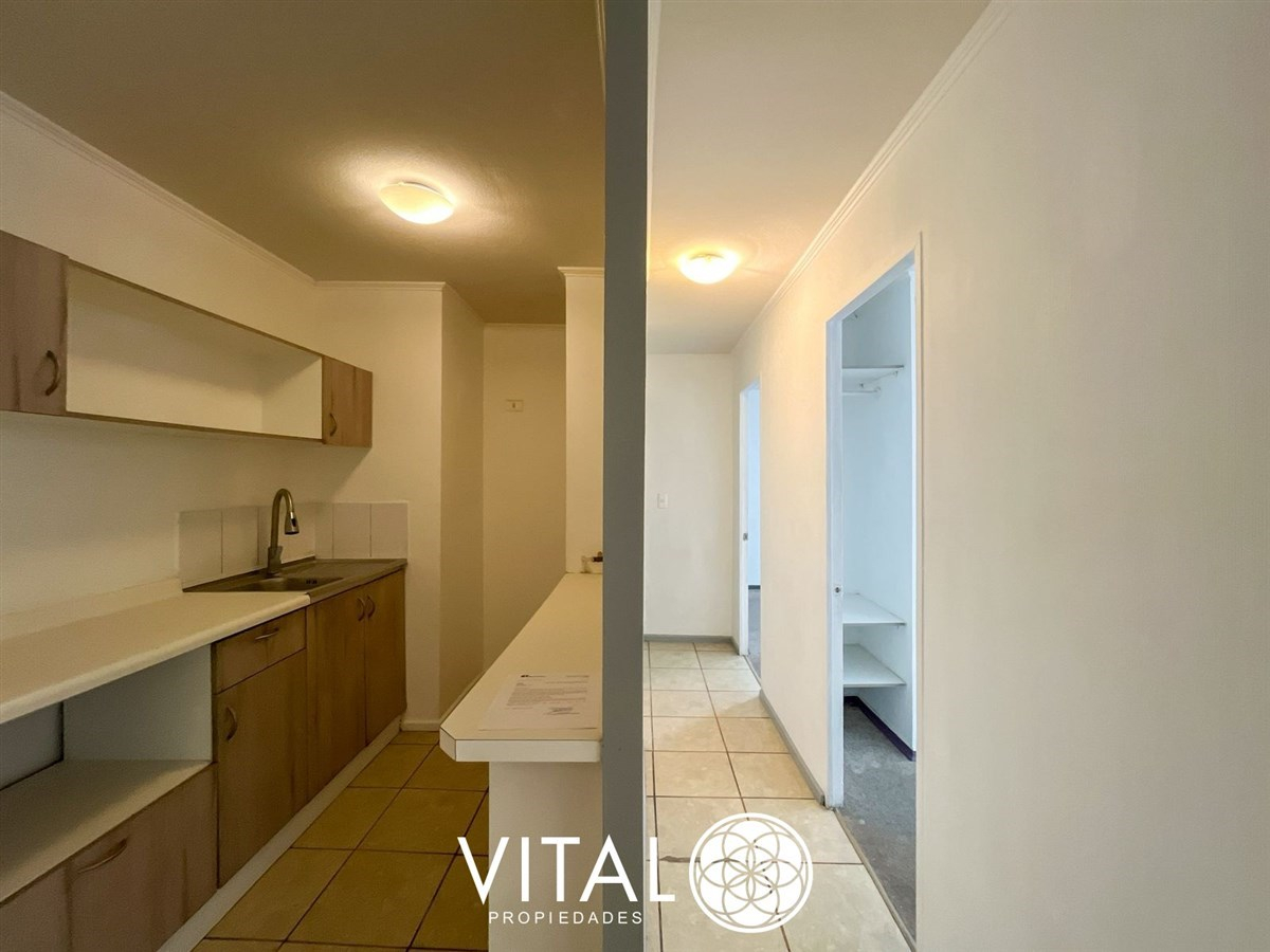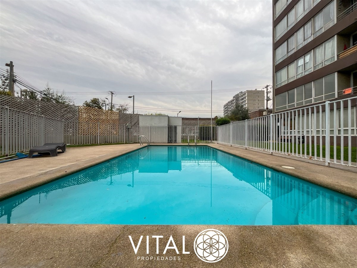 El departamento tiene una distribución práctica y funcional, con 2 dormitorios, 1 baño y una cocina equipada con muebles empotrados. El edificio cuenta con piscina, quinchos, juegos infantiles, sala de eventos y lavandería.
