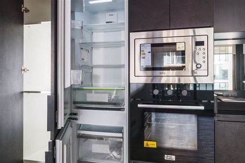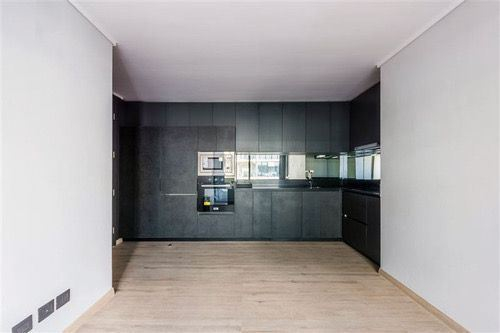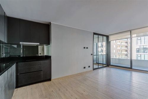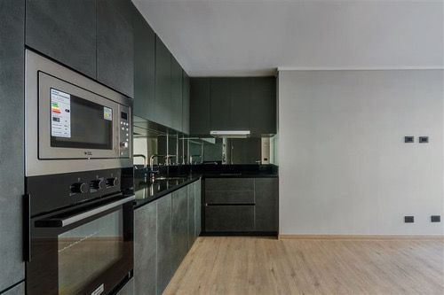Cocina americana con electrodomésticos integrados: Refrigerador, Horno y Microondas. Con espacio para mesa de comedor.