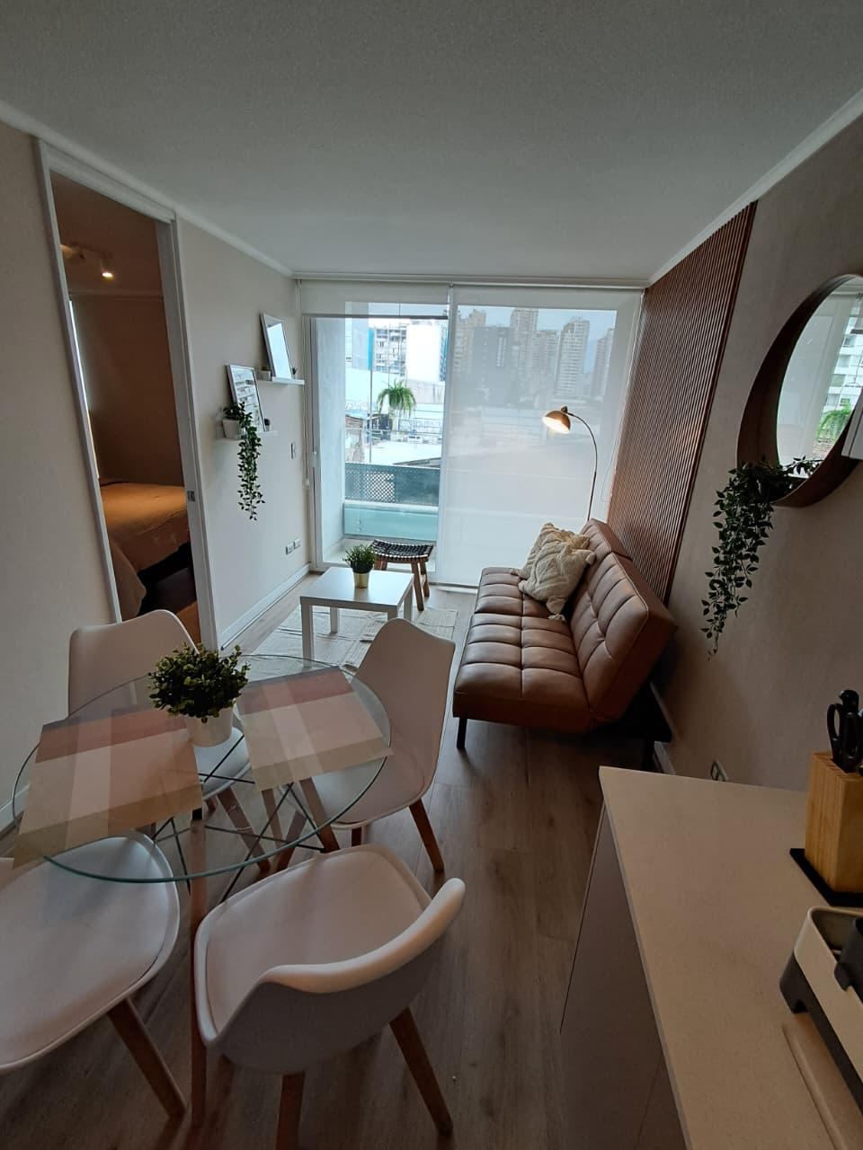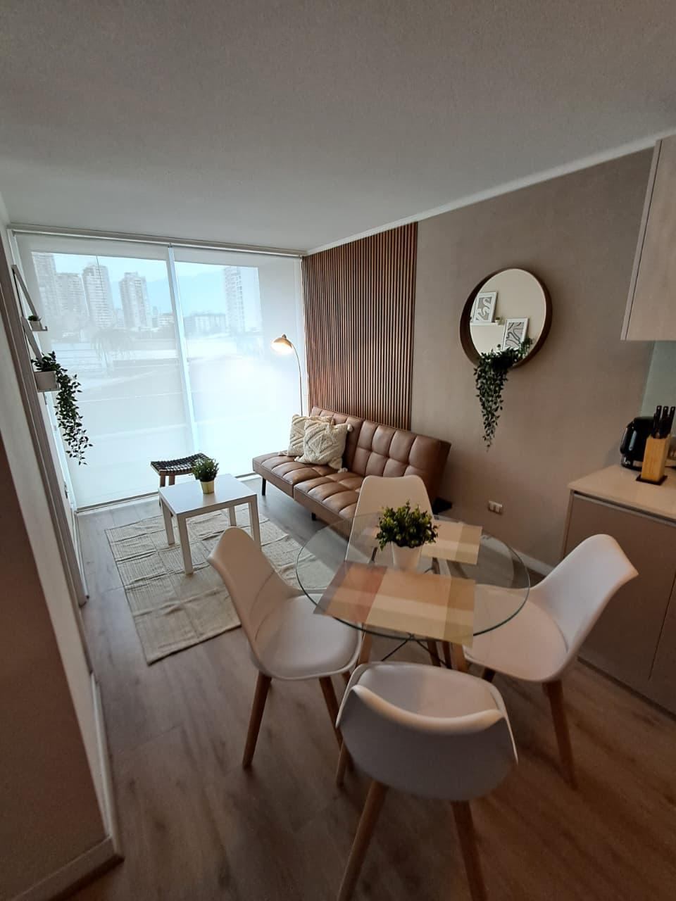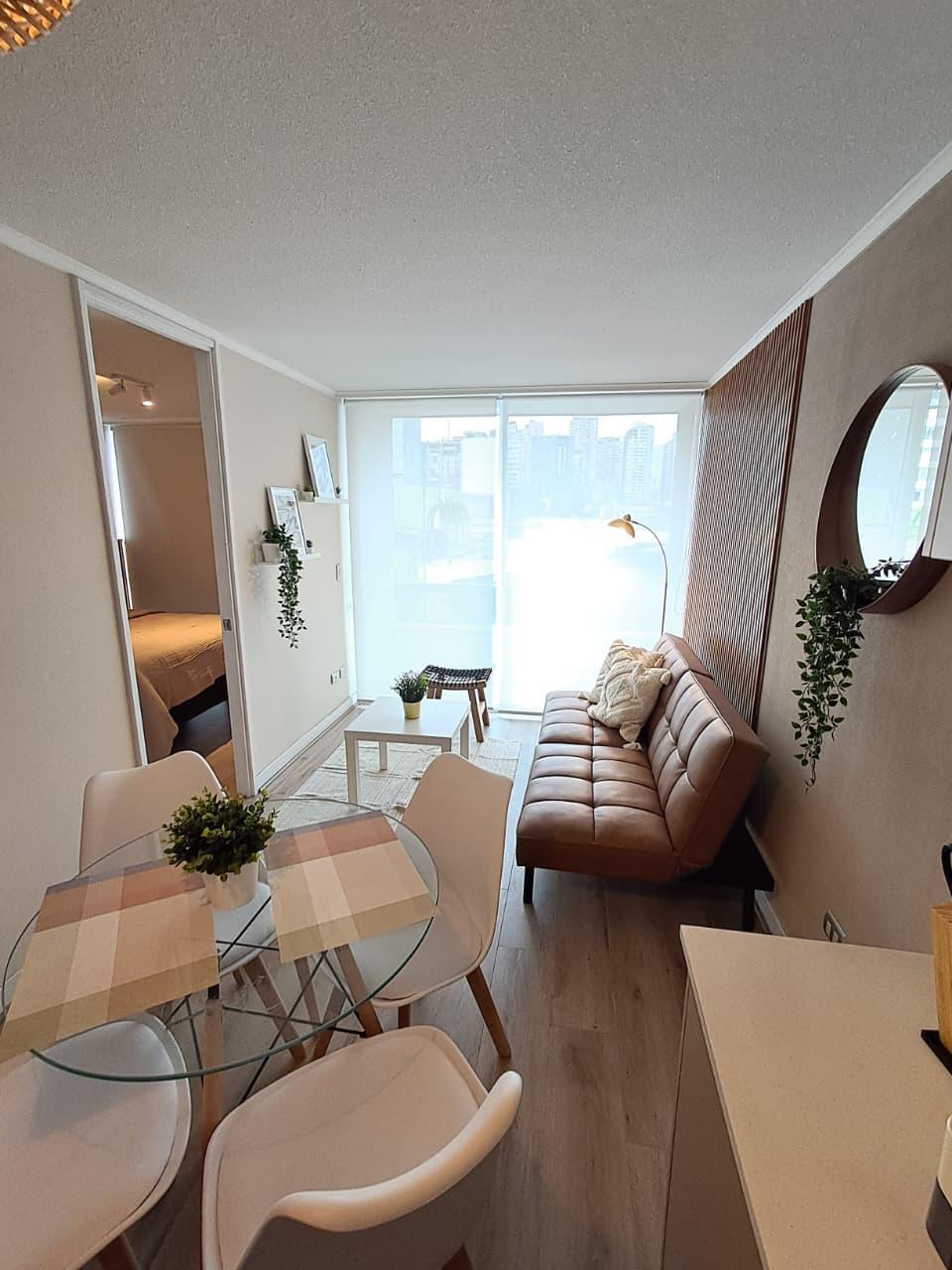 El departamento cuenta con un dormitorio en suite, un baño completo y un balcón que brinda vistas al entorno. Las comodidades incluyen acceso a internet, un área verde para relajarse, y un ascensor que facilita el acceso. A pesar de no contar con estacionamiento, la ubicación estratégica permite un fácil desplazamiento por la ciudad. Los gastos comunes ascienden a CL$60.000, lo que incluye servicios que garantizan un ambiente seguro y cómodo.