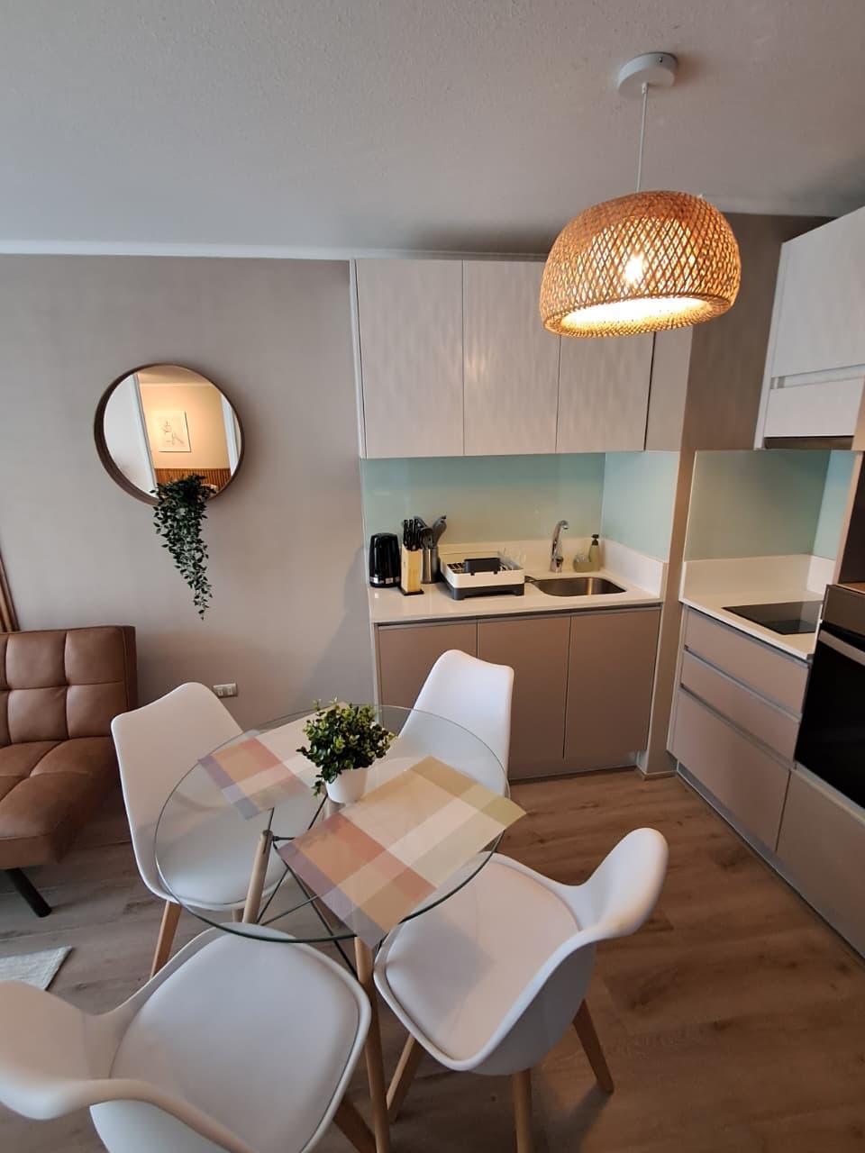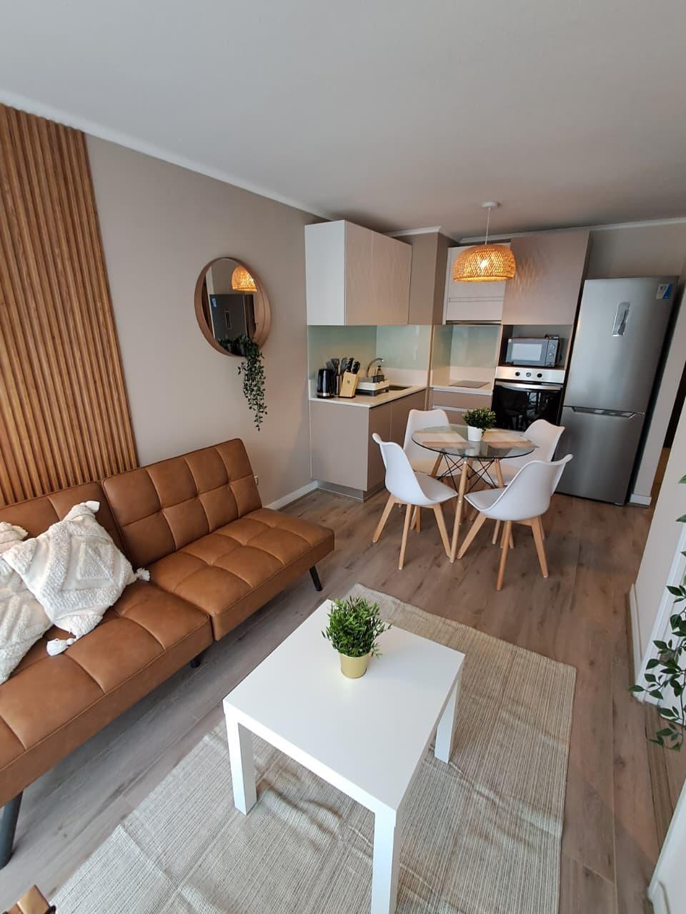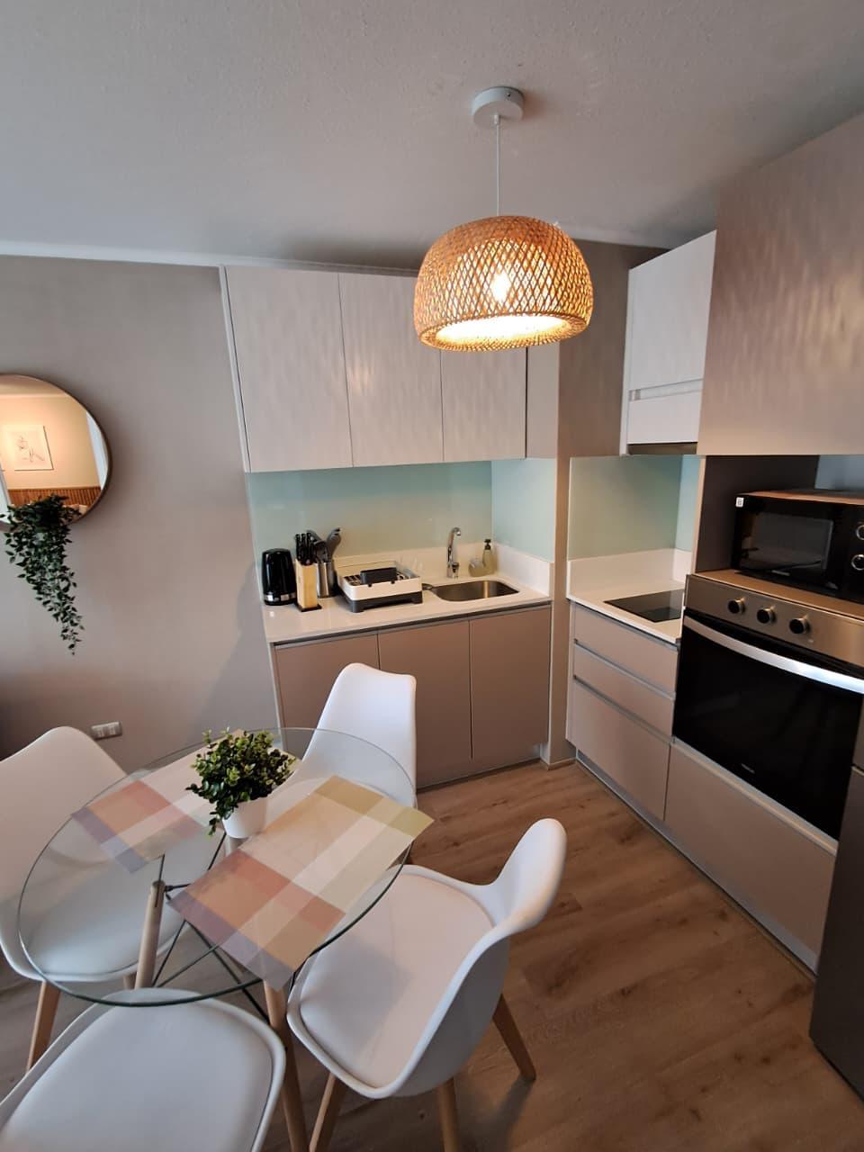 El departamento cuenta con un dormitorio en suite, un baño completo y un balcón que brinda vistas al entorno. Las comodidades incluyen acceso a internet, un área verde para relajarse, y un ascensor que facilita el acceso. A pesar de no contar con estacionamiento, la ubicación estratégica permite un fácil desplazamiento por la ciudad. Los gastos comunes ascienden a CL$60.000, lo que incluye servicios que garantizan un ambiente seguro y cómodo.