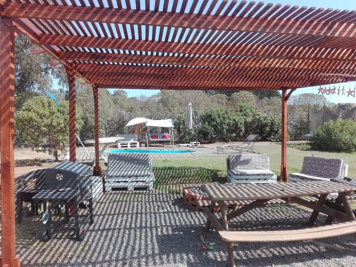 El exterior de la casa es igualmente atractivo, con un jardín bien cuidado, patio y parrilla, perfectos para disfrutar de reuniones al aire libre. La propiedad también ofrece acceso a una refrescante piscina y un área de juegos infantiles, lo que la convierte en un lugar ideal para familias con niños. Además, cuenta con estacionamiento para 6 vehículos, lo que asegura comodidad y facilidad de acceso.