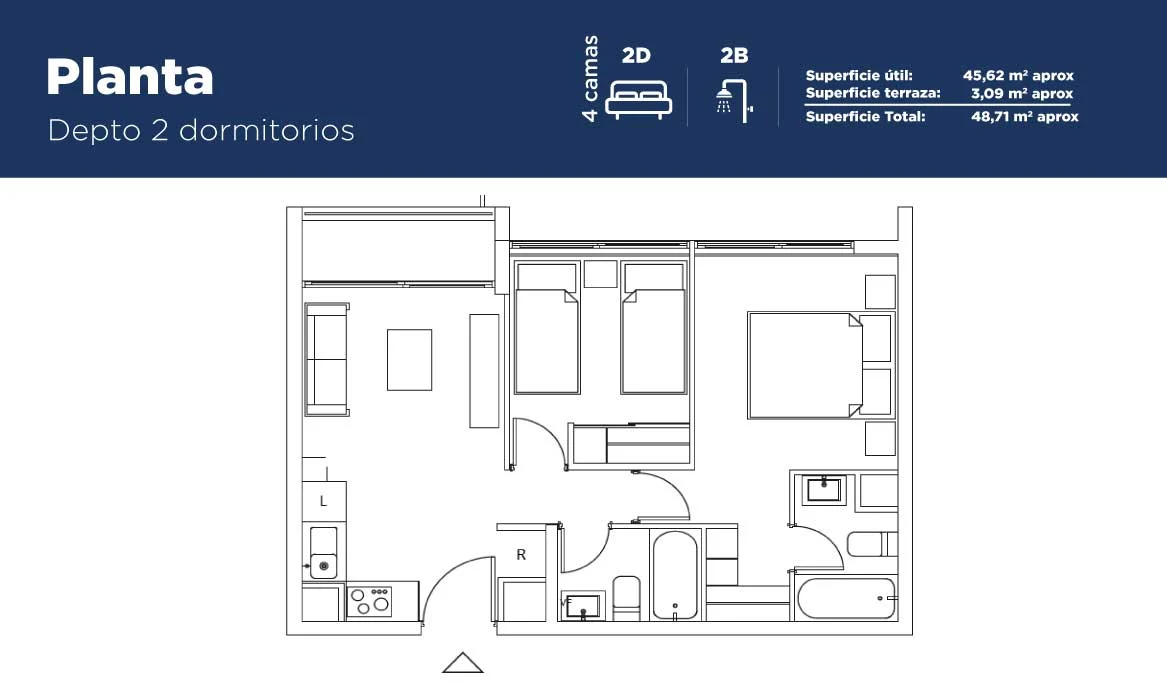 Tipología mariposa dormitorios, dos baños y una cocina equipada.