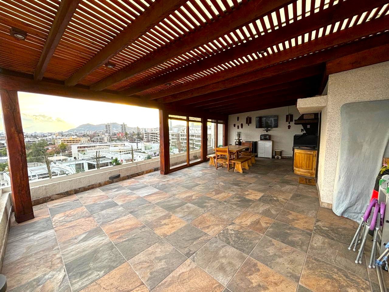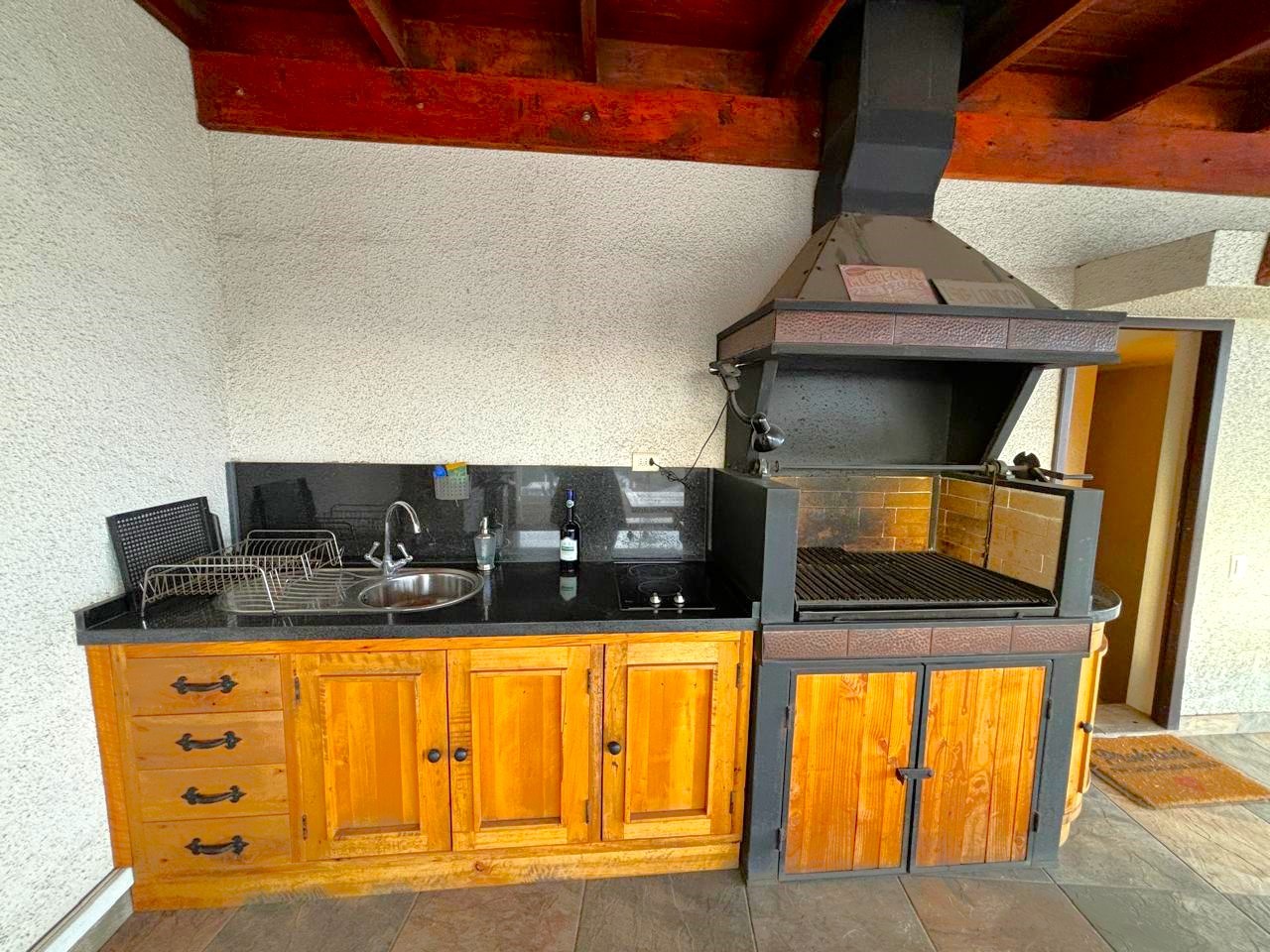 – Maravillosa terraza con quincho techado en madera y policarbonato, equipado con parrilla, campana, encimera, lavaplatos e iluminación