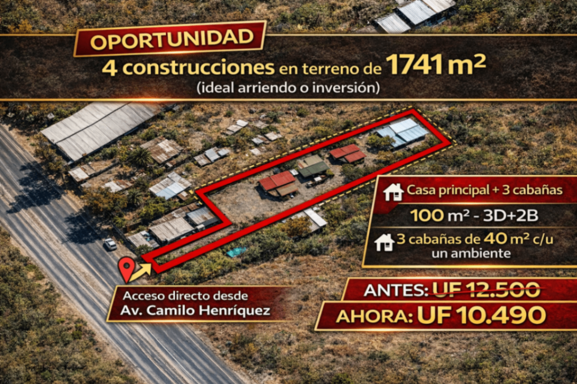 Vendo gran terreno de 1741m2 con 1 casa principal y 3 cabañas en Puente Alto.