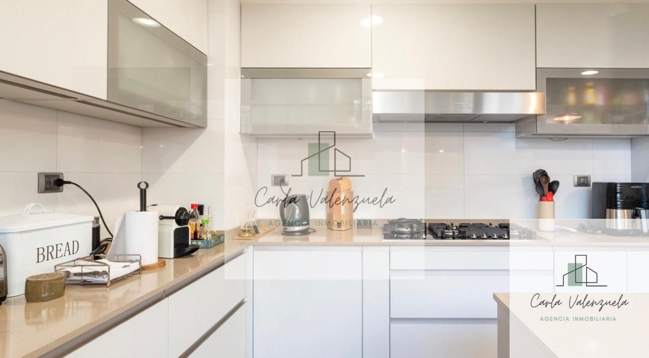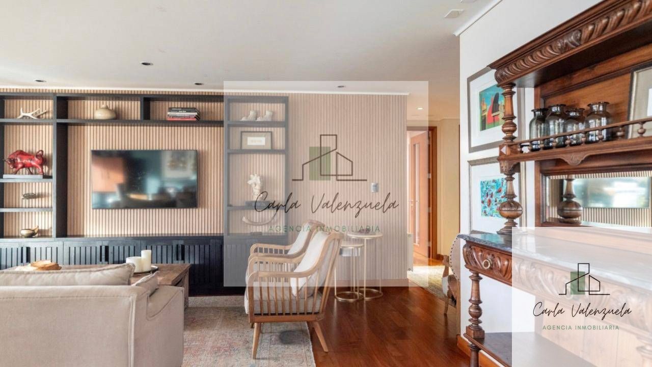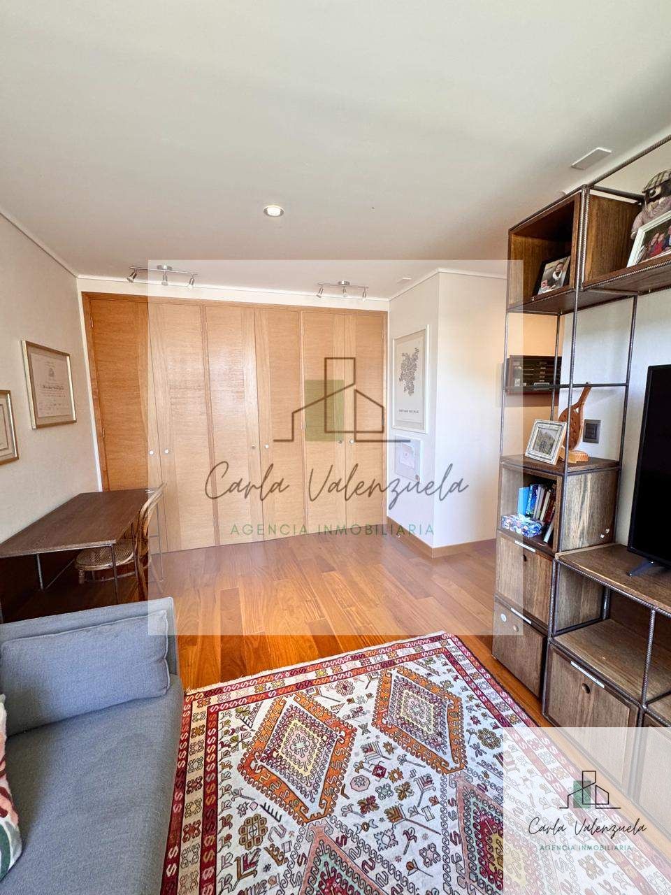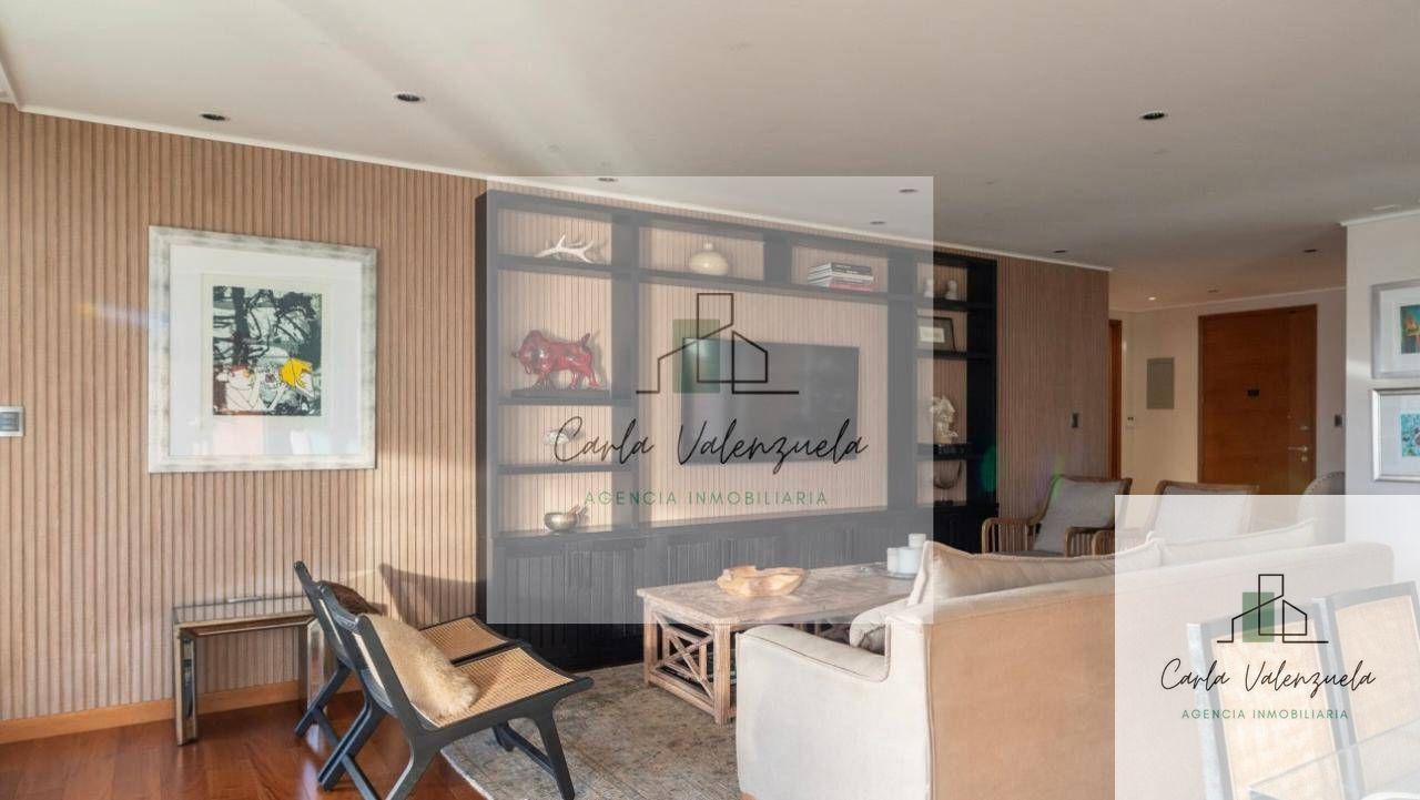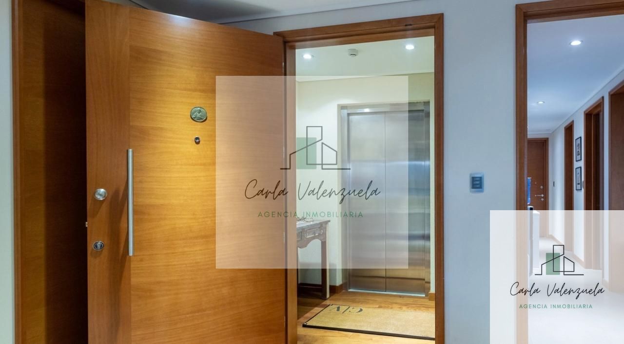 El departamento cuenta con una distribución excepcional que incluye un ascensor privado con acceso directo al recibidor, un amplio living-comedor con salida a la terraza, una sala de estar independiente, y un dormitorio principal en suite con walk-in closet y salida a la terraza. Además, dispone de dos dormitorios adicionales en suite, un baño de visitas, y una cocina independiente con isla central y cubierta de Silestone. Los acabados son de primera, destacándose la calefacción por radiadores, ventanas termopanel, y pisos de madera natural en las áreas principales. Incluye también 2 estacionamientos techados y 1 bodega.