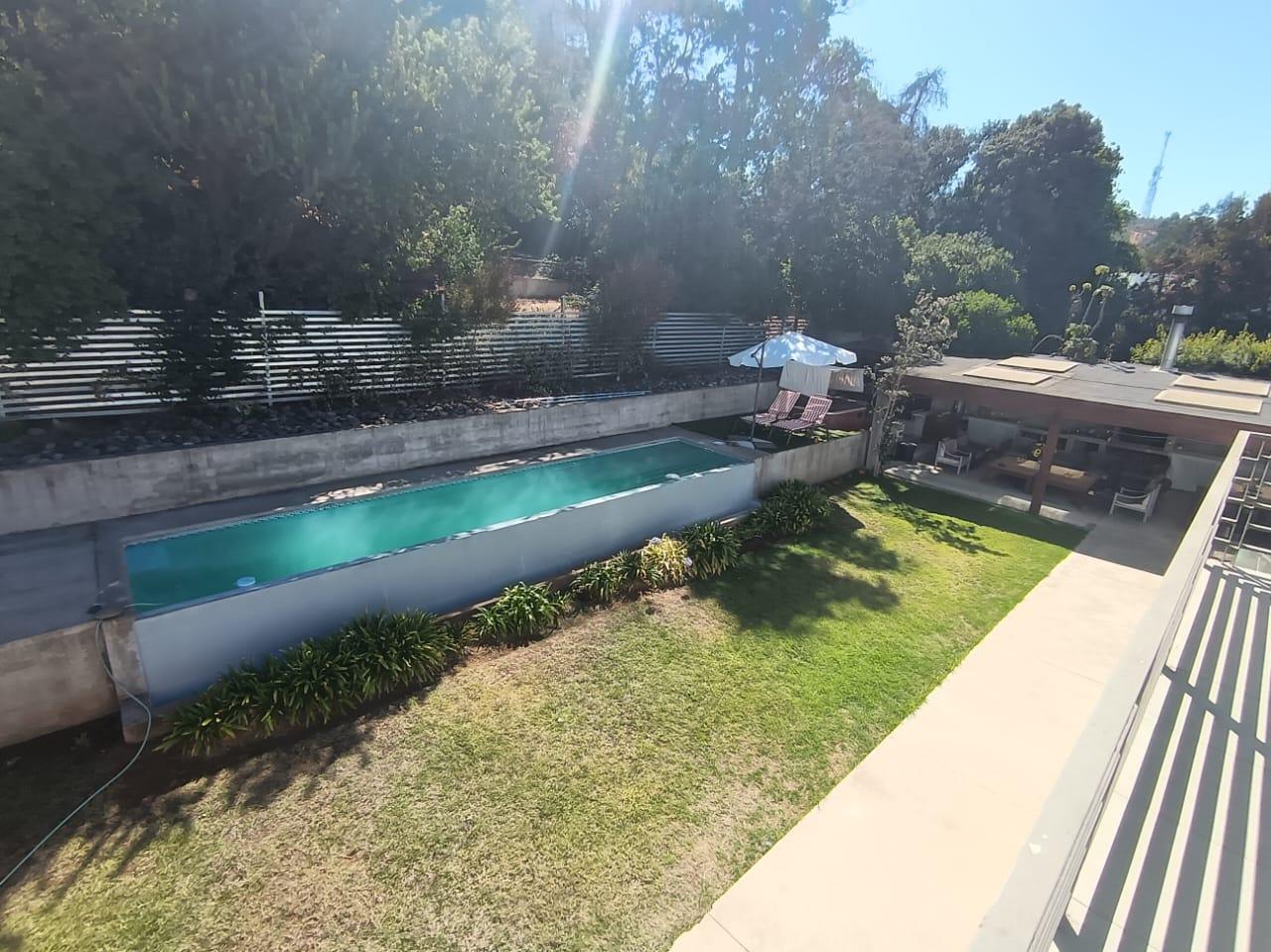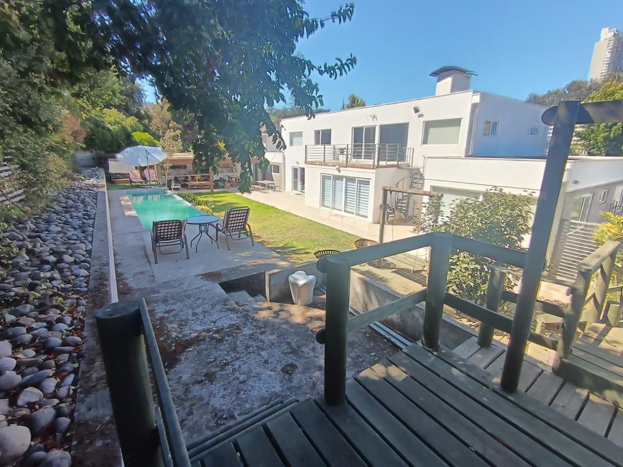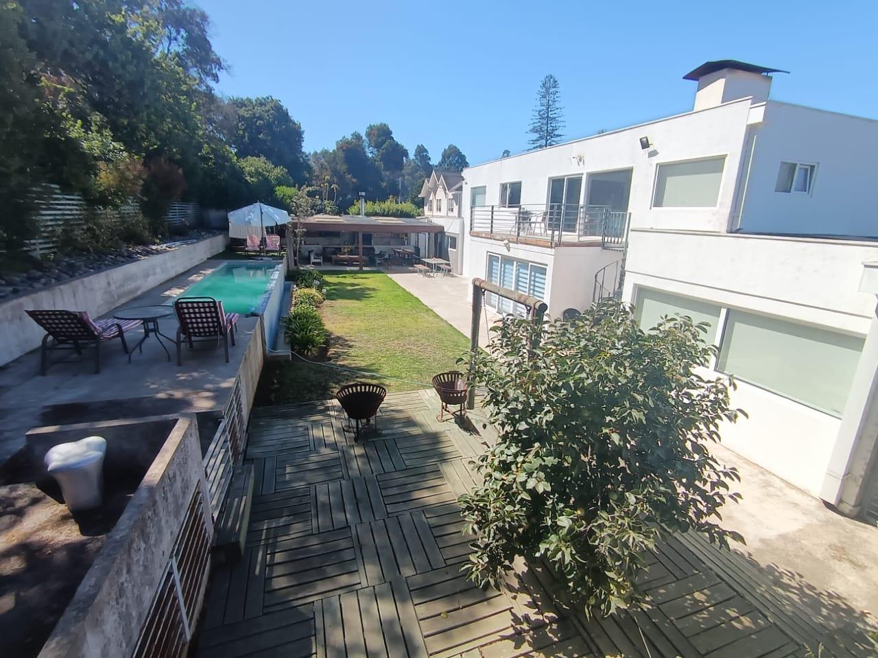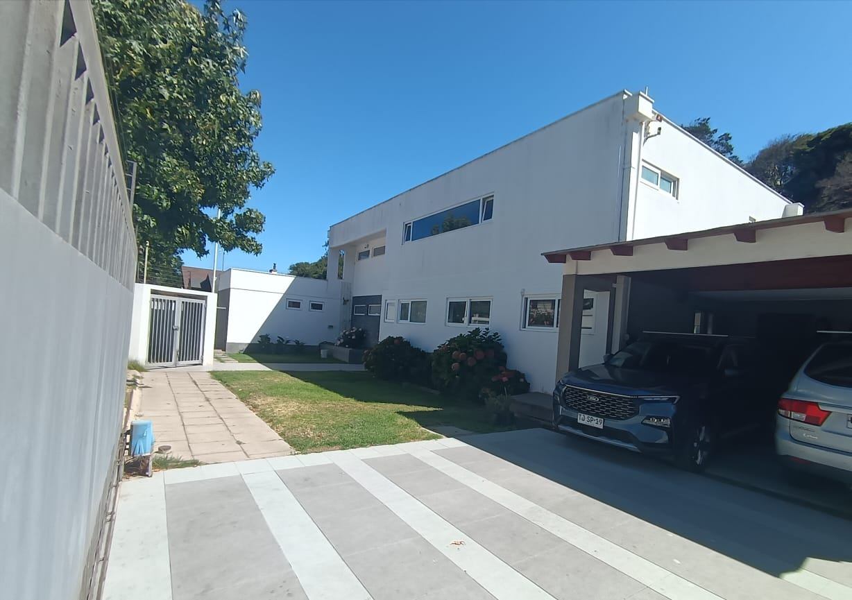 La casa destaca por su gran piscina de 10 m por 2,5 m, un quincho de 50 m², sauna y jacuzzi, perfectos para disfrutar de momentos de relajación y entretenimiento. Dispone de dos salas de estar, un living y comedor separados, así como una amplia cocina con isla y comedor de diario. Las ventanas termo panel garantizan un excelente aislamiento térmico, mientras que la calefacción por losa radiante en el primer piso, complementada con chimenea y bosca, asegura un ambiente cálido y acogedor en todo momento. Los acabados de alta calidad incluyen pisos de porcelanato, riego automático en el jardín y antejardín, y amplios espacios que brindan comodidad y funcionalidad a cada rincón del hogar.