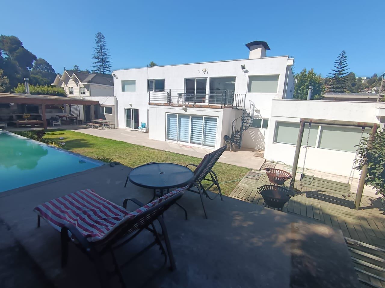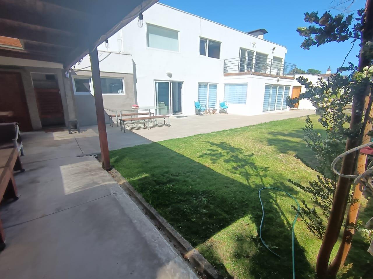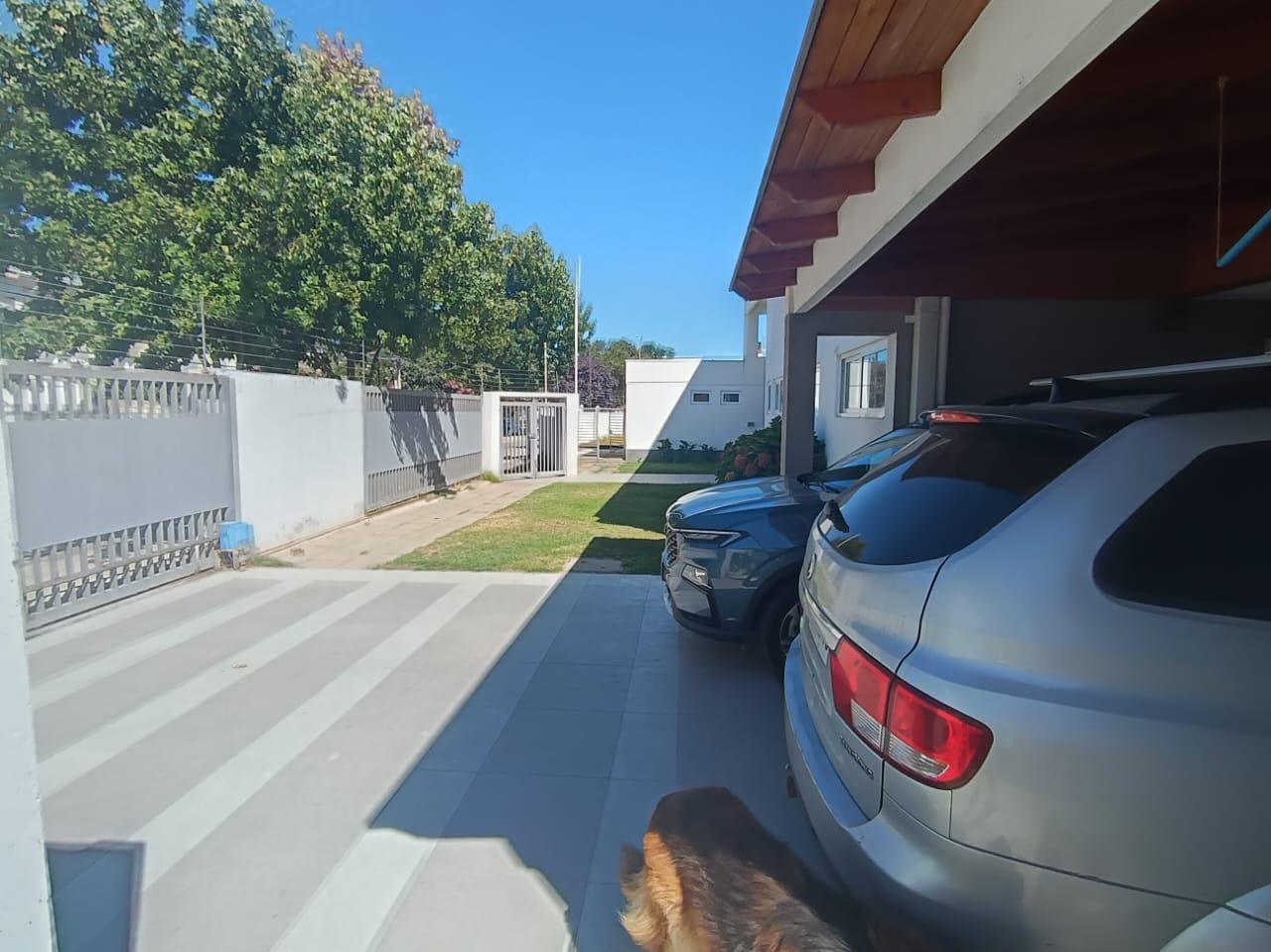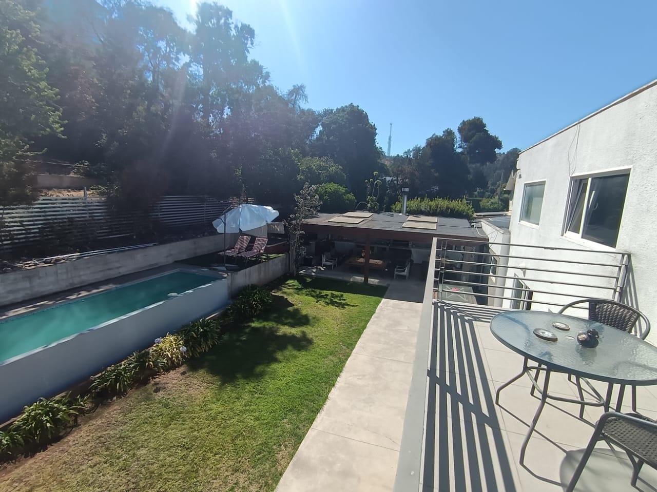 La casa destaca por su gran piscina de 10 m por 2,5 m, un quincho de 50 m², sauna y jacuzzi, perfectos para disfrutar de momentos de relajación y entretenimiento. Dispone de dos salas de estar, un living y comedor separados, así como una amplia cocina con isla y comedor de diario. Las ventanas termo panel garantizan un excelente aislamiento térmico, mientras que la calefacción por losa radiante en el primer piso, complementada con chimenea y bosca, asegura un ambiente cálido y acogedor en todo momento. Los acabados de alta calidad incluyen pisos de porcelanato, riego automático en el jardín y antejardín, y amplios espacios que brindan comodidad y funcionalidad a cada rincón del hogar.