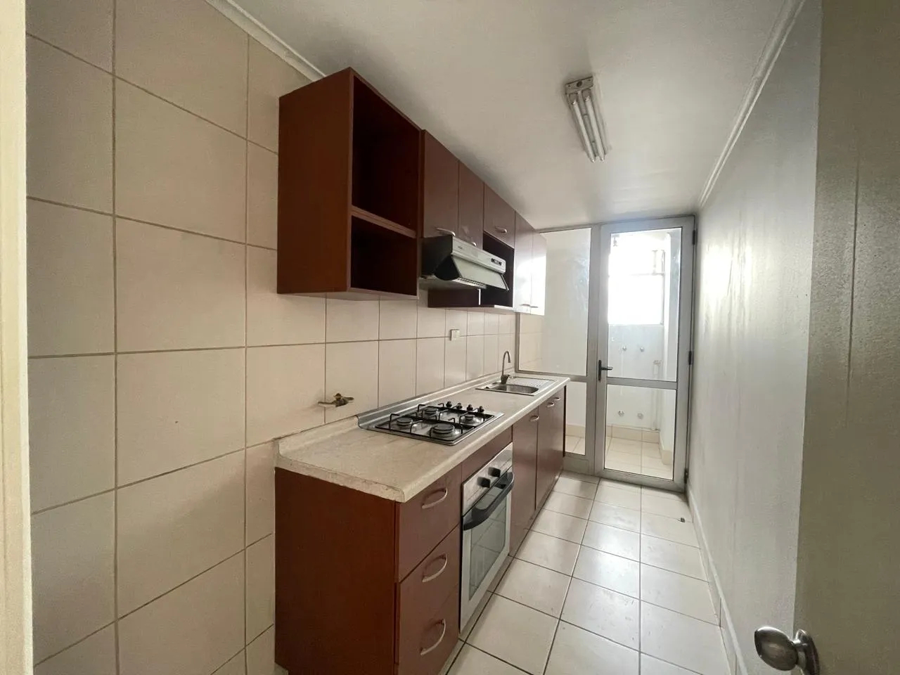 – Hall de entrada, Cocina amoblada y equipada con encimera de 4 platos a gas, horno empotrado eléctrico, logia con conexión a lavadora.