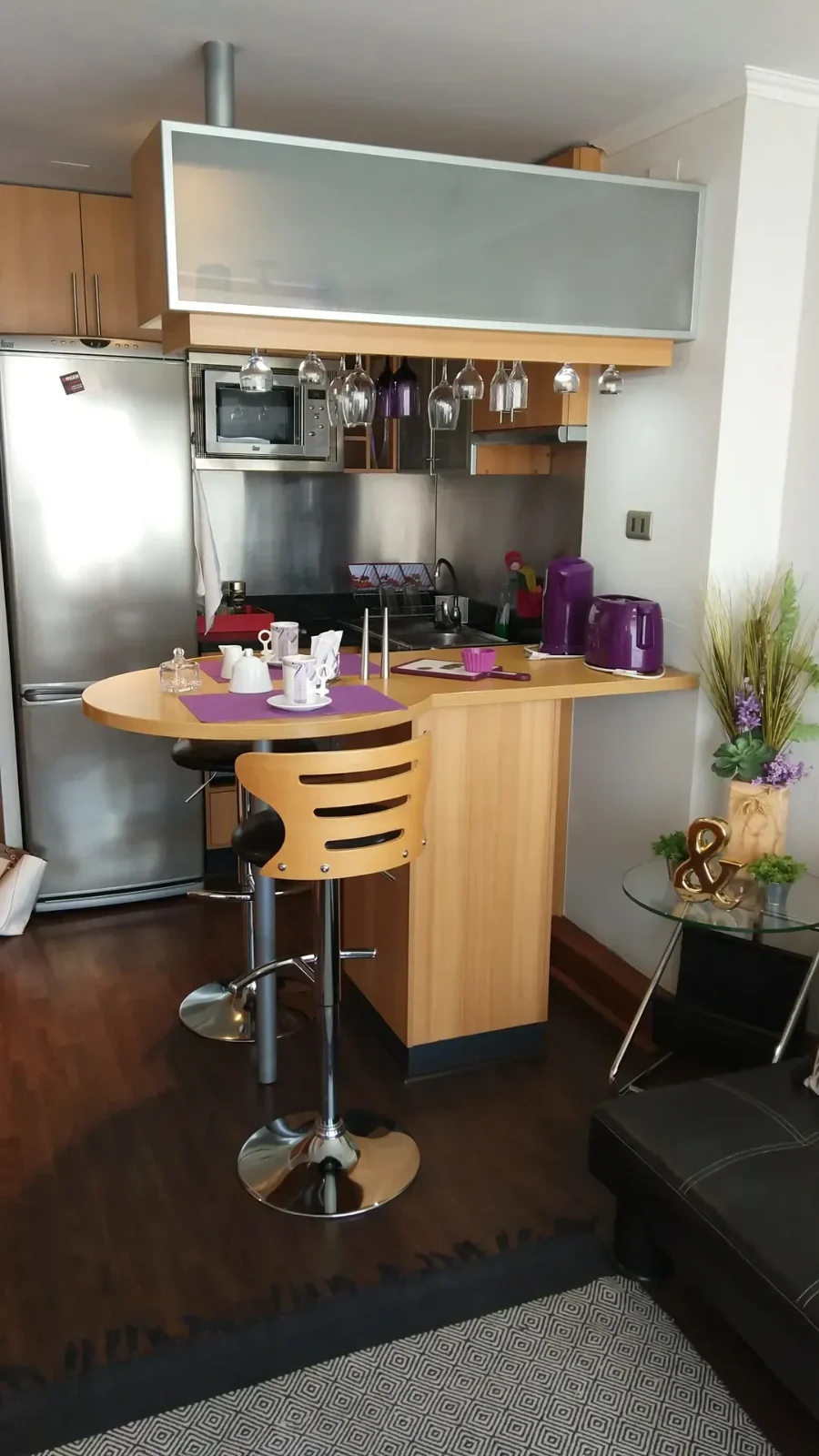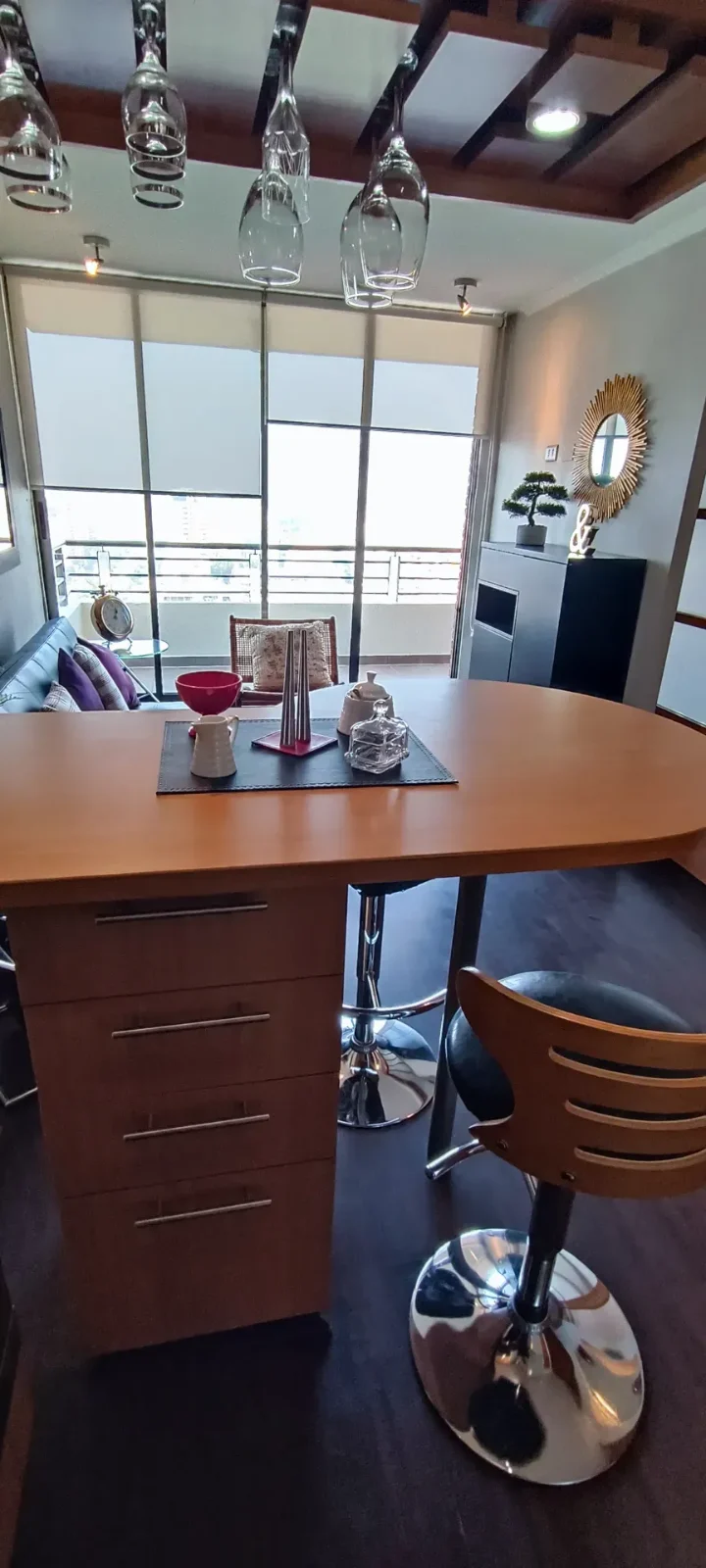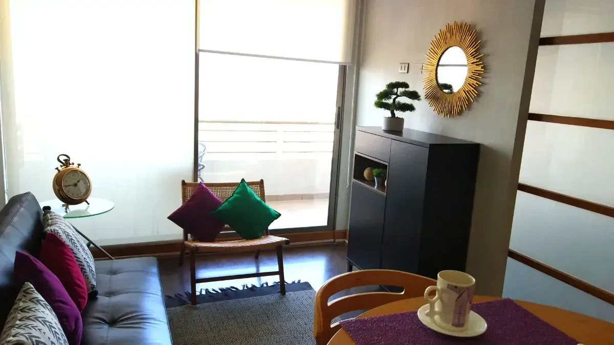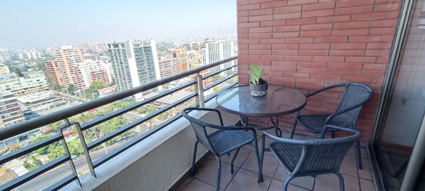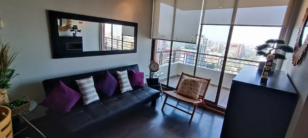 Moderno y luminoso departamento a pasos del Metro Escuela Militar, con espectacular vista despejada a la cordillera. Cuenta con 1 dormitorio en suite, cocina integrada, living-comedor y terraza. Totalmente amoblado y equipado, con calefacción central y conexión a internet. Incluye estacionamiento subterráneo.